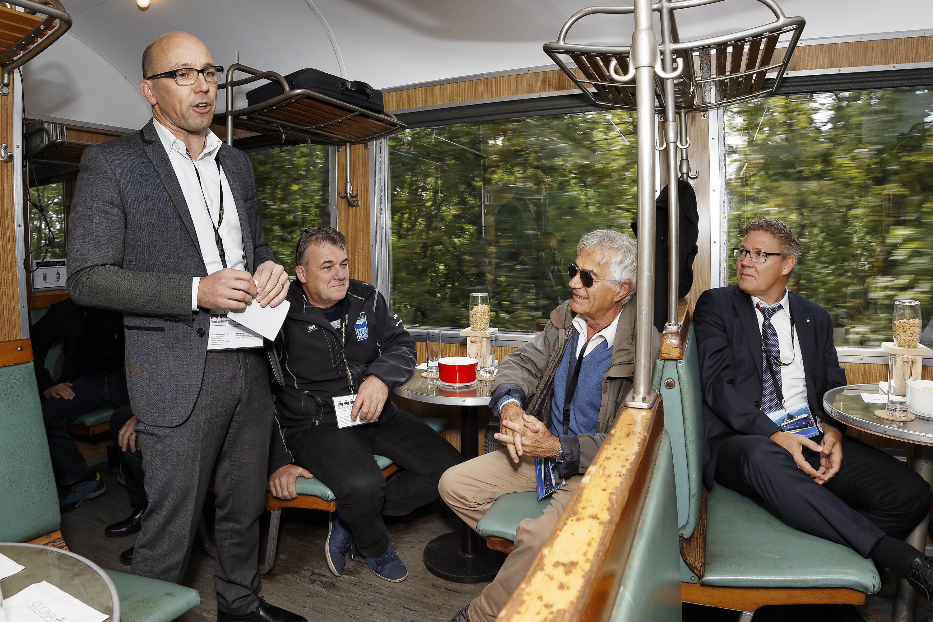 Photo 1: Stefan Müller-Altermatt, président de l’Association Tunnel du Weissenstein LIGNE 411, parle pendant le trajet de Soleure à Saint-Joseph. Assis (de gauche à droite): Konrad Stuber, le directeur de la télécabine Weissenstein et membre du bureau de l’association LIGNE 411, le Conseiller d’Etat Roland Fürst et le vice-président Walter Straumann.
