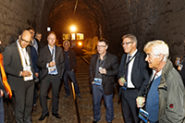 Photo 2: Arrêt devant la source d’eau au milieu du tunnel (de gauche à droite): le président Stefan Müller-Altermatt, Daniel Wyder, chef de l’infrastructure de la BLS, Jürgen Hofer, directeur de Region Solothurn Tourismus, le Conseiller d’Etat Roland Fürst et le vice-président Walter Straumann.