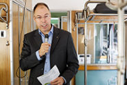 Photo 3: Il donne des informations pendant le trajet: Daniel Wyder, chef de l’infrastructure de la BLS.